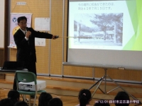12月1日は古道小学校の創立記念日です。本校は、東日本大震災による原発災害のため、しばらく古道を離れて教育活動を行っていました。今年の4月、3年ぶりに古道にて学校を再開しました。この機会に、あらためて古道小学校の歴史と伝統にふれる場を設け、学校や自分に対する誇りと愛着を養うことを目的として創立記念集会を実施しました。昔の懐かしい校舎や教育活動の様子をスライドで紹介したり、本校の先輩の逸話などを紹介したりするなどして、学校や自分を振り返る機会としました。