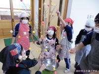 かさまつの学習では、郷土をテーマに学習をしてきました。今日は、小正月に行う「だんごさし」の体験をしました。地域の方を講師の先生としてお招きし、昔から伝わる風習にふれる時間となりました。