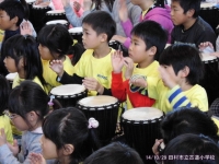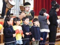 発表のあとは、ドラムカフェのみなさんと一緒に太鼓の演奏をしました。子どもたちはリズムにのりながら、楽しそうに太鼓を叩いていました。
