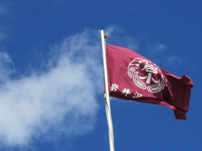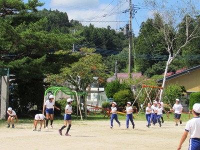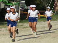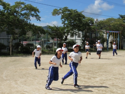 気持ちの良い青空の下、元気よく走る子どもたち。校旗も気持ちよさそうに見守っています。