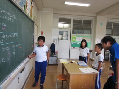 3年生は自分の考えを黒板に書き、互いに発表しています。