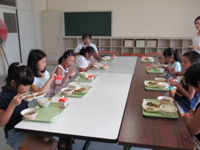 その後は、岩井沢小学校で一緒に給食を食べました。
