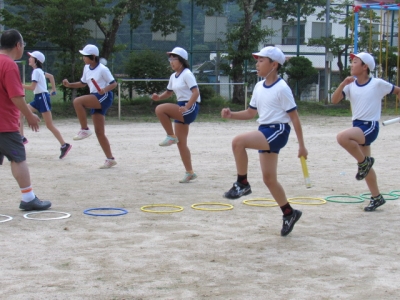 6年生と5年生でリレーの練習。上手にバトンを渡すぞ!