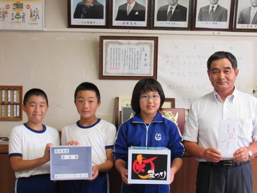 本校の3名が、灯祭りの際にいただいた募金を、灯祭り実行委委員長さんと一緒に、熊本地震の被災者の皆様に届けていただくよう、新聞社の方にお渡ししました。