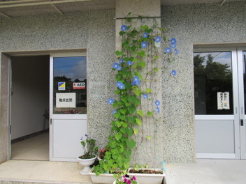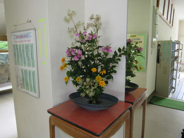 玄関に入るときれいなお花がお出迎え。用務員さんが生けてくださいました。