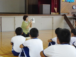 今日の全校集会では、用務員さんが都路地区に古くから伝わる「五十人山の大蛇」の昔話を披露しました。