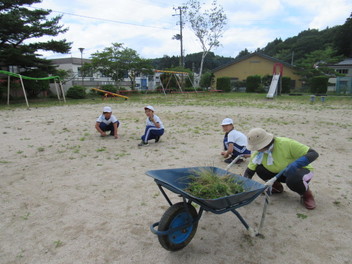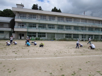 夏休み中に少しでも雑草が生えないようにと用務員さんと3年生が校庭の草むしりを始めました。すると、ランランタイムを終えた子どもたちも加わり、結局みんなで草むしりをしました。