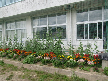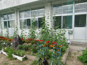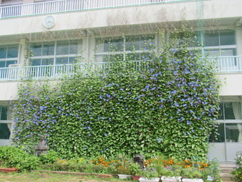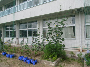校舎前に植えた、アサガオ、ヘチマのつるがどんどん伸びています。夏休み中も生長が楽しみです。