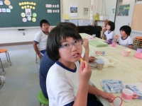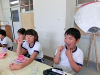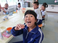 「ごちそうさま」のあとは、全校生ではみがきです。イエテボリ法で、きれいにはみがきができていました!!