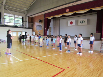 まず、あすの田村地区小学校音楽祭にむけて、全校生で合唱練習。