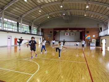 その後、5,6年生は陸上競技の練習。昨日の台風の影響で校庭が使えず、今日は体育館で行いました。