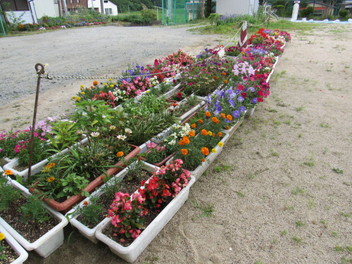 用務員さんが、3年生にお手伝いしてもらって、国道沿いの歩道や正門の階段に置いてあったプランターを校庭の水飲み場の近くに移動しました。これで夏休みの水やりも大丈夫です。