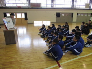 毎週月曜日に集会委員会の運営で、開催されます。今日は1年生の担任の先生によるブックトークでした。また、読書の大切さもお話ししていただきました。