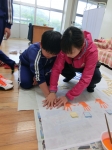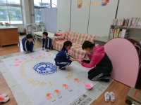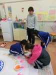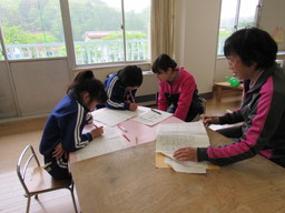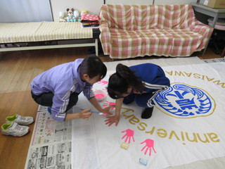 運動会を盛りあげるために、また岩井沢小学校の団結力を高めるために、横断幕を作成中です。
