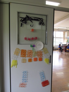図工の作品です。いつもの教室のドアに作品をつくりました。教室に入るのが楽しくなりますね。
