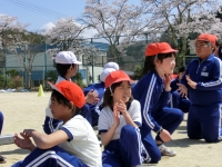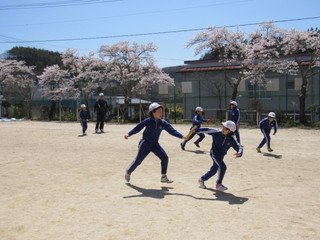 気持ちの良い青空のもと、3,4年生の合同体育。リレーのバトンパスの練習です。「はい。」と大きな声を出して渡していました。