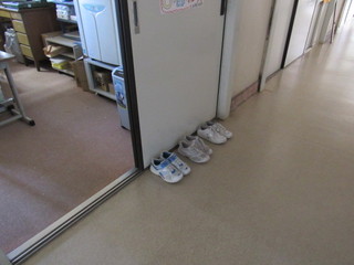 いつもすばらしいと感じていたのが、この風景です。印刷室の奥の放送室で朝の放送をおこなっている放送委員の子どもたちの上ばきです。