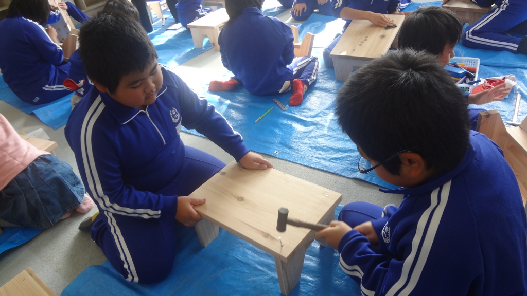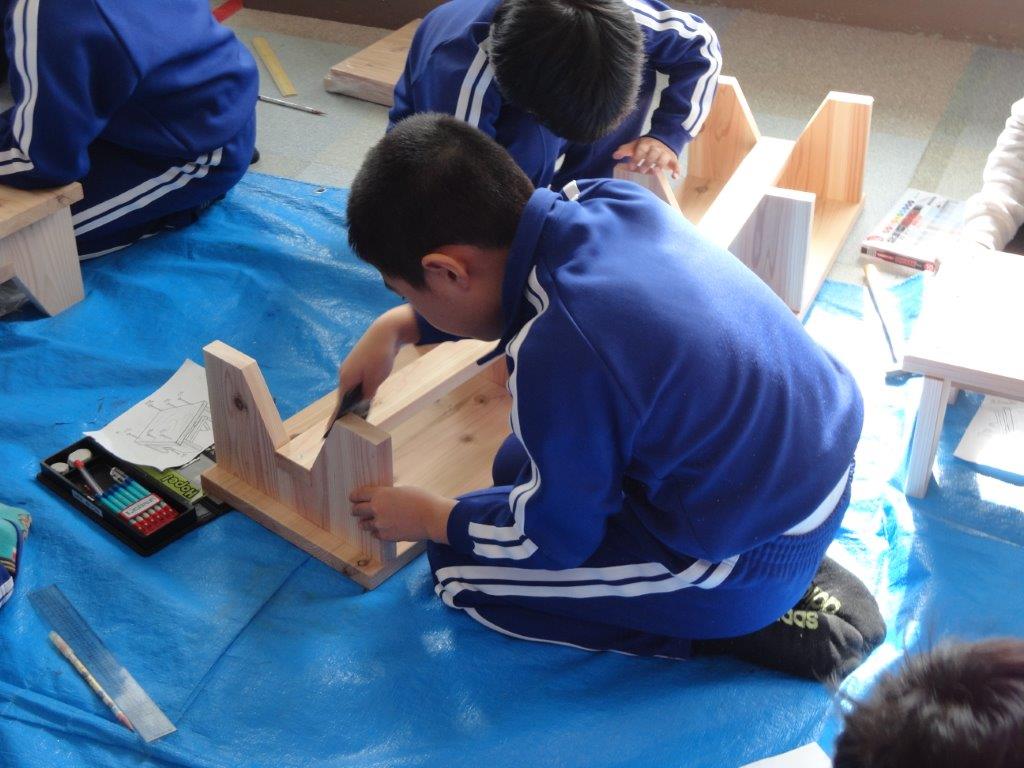 24日(火)の3・4校時に森林組合の方をお招きして、『森林教室』を行いました。全校生が参加し杉材で台をつくりました。