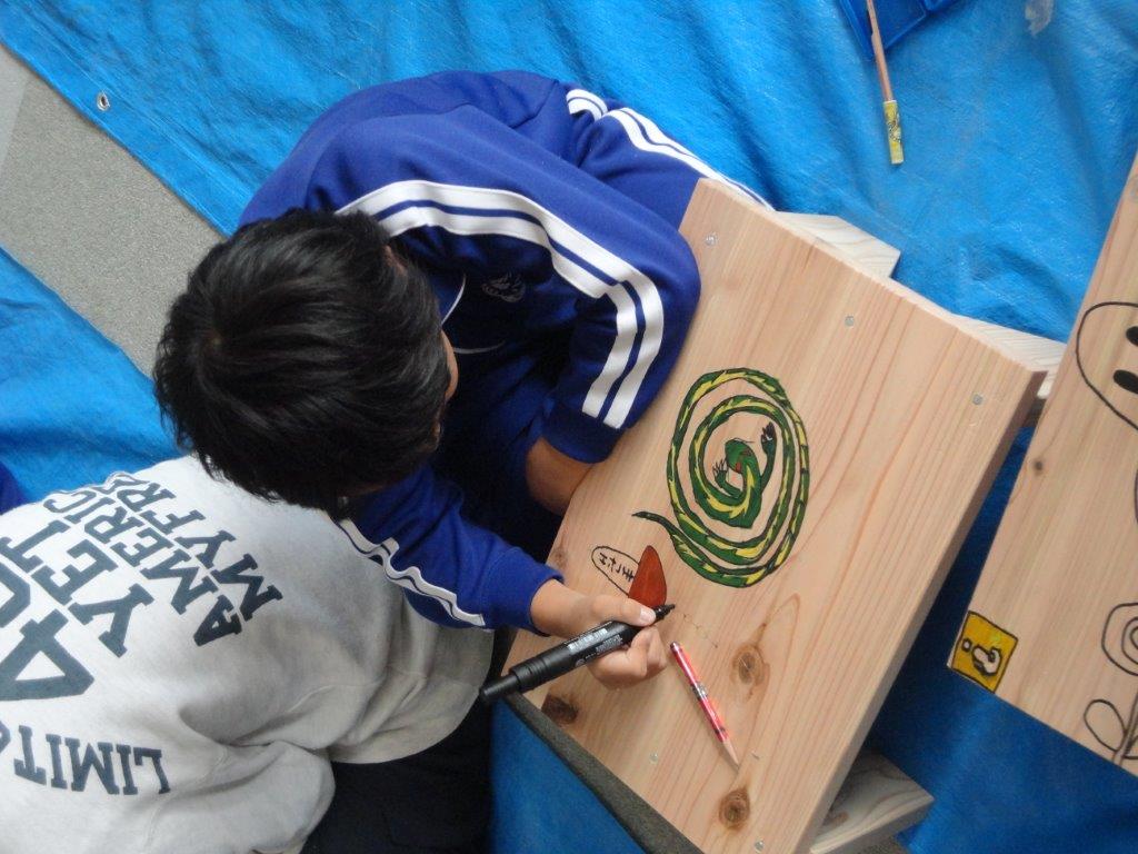 2人組で上級生と下級生が協力しながら、釘を打ったり、紙やすりで磨いたり、絵をかいたりして仕上げました。