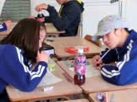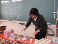 次に、実際にジュースに含まれている砂糖の量をお湯や炭酸水で溶いて飲み比べてみました。みんなお湯で溶いた方は「甘すぎる~」といって驚いた様子でした。
