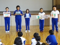 ワクワククラブは、いろいろ簡単な実験をしたり、パソコンを使って名刺や絵を描いたりしたことを紹介しました。「今日は、1・2・3年生に作った名刺を配り、3年生には、空気砲をやってもらいます。まずは、自分達でお手本です。」