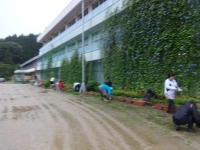 学校の裏の土手の一部が土砂崩れを起こし、物置にしていたところに土砂が堆積してしまいました。普段から、子ども達の教育活動には直接関わらないエリアなので、心配はありませんが、土砂の堆積による冠水がおこっていることもありますので、できるだけ早く通常の状態にもどせるよう努力いたします。ご心配をおかけいたしますが、どうぞよろしくお願いいたします。