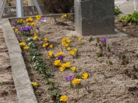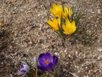花壇には、子どもたちが植えた球根の芽がたくさん出ています。そして、クロッカスがきれいに咲き始めました。“春よ来い”ですね。