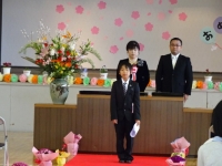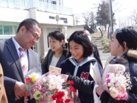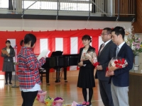 転出される先生方             児童からの感謝の花束贈呈        お別れのことば