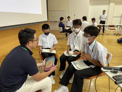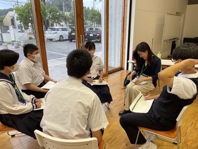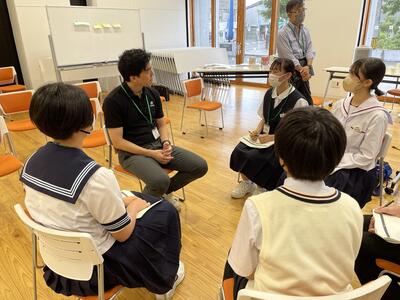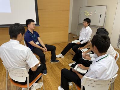 4つのグループに分かれて、将来の夢、講師の先生への質問など、自由に語り合っています。