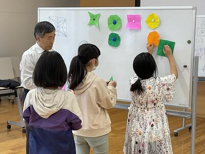 次に、折り紙で鶴を折ってみてました。その後、「もしもひし形だったら?」「もしもたこ形だったら?」どんな鶴ができるか想像してみました。そして、想像した通りになるか試してみます。