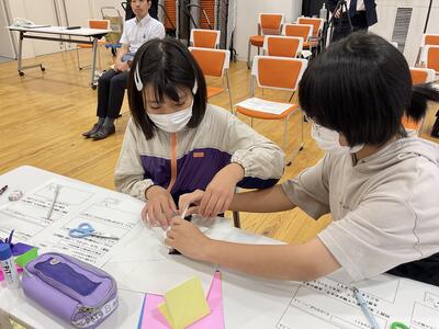 半分、もう半分に折った折り紙の一辺を、各自、自由に切り取って八角形を作った後は、その中の一つの八角形と同じ八角形を作ってみます。