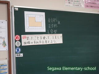 長方形と正方形の面積の求め方を学習した子ども達は、それを使って複雑な図形の面積の求め方を工夫します。