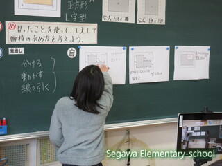 新たな練習問題にも取り組みました。Hさんは、図形を移動して長方形にしたあとに面積を求める方法を発表しました。