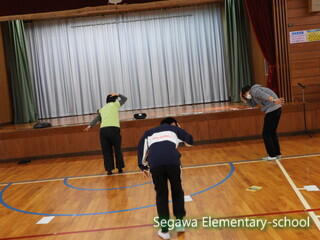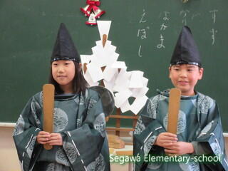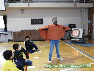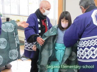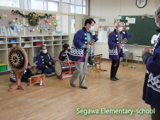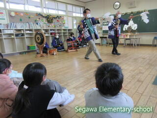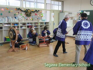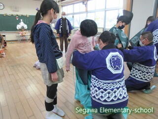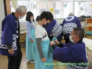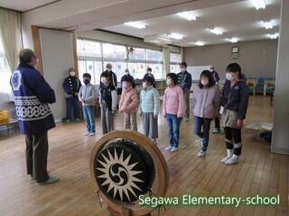 瀬川小学区は4つの大字に別れていますが、それぞれに神楽や獅子舞が伝承されている地域です。34年生は、11月に総合的な学習で訪問してきた福島県指定重要無形民俗文化財の「大倉の太々神楽」保存会の皆様をお招きし、体験させていただくことにしました。