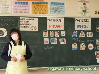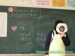 題して「かぜ大ま王にまけないぞ!」です。担任と養護教諭が分担して、指導します。