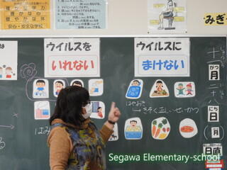 一生懸命自分のこととして考えます。そこで、養護教諭から「ウィルス」というばい菌がつくとかぜを引いてしまうことを教えます。