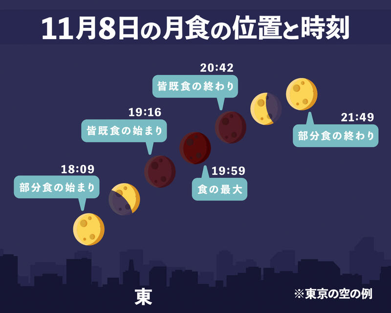月は、18時9分から欠け始め、19時16分に皆既食となります。皆既となった月は、「赤銅色(しゃくどういろ)」と呼ばれる、赤黒い色に見えます。皆既食は86分間続いて20時42分に終わり、その後は徐々に月は地球の影から抜けて、21時49分に部分食が終わります。