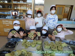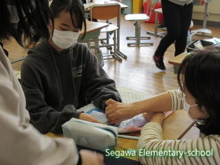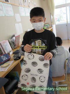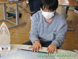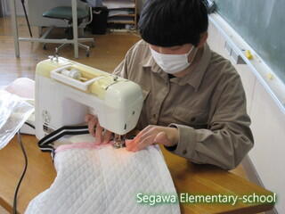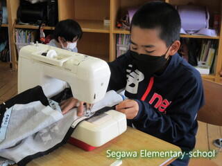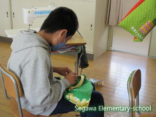 56年生の家庭科は、よく見るとエプロンと袋です。学習が発展しているのが分かります。