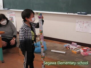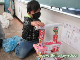 1年生は、缶や箱を積み上げる造形遊びの題材です。