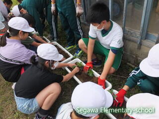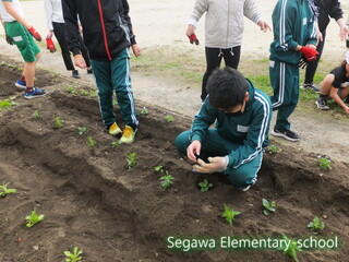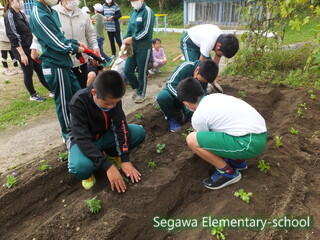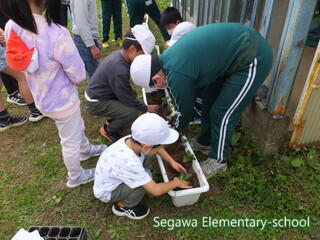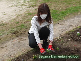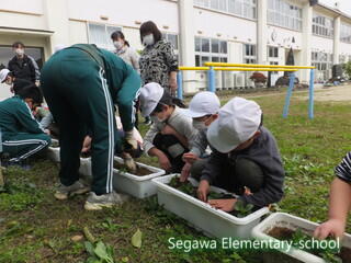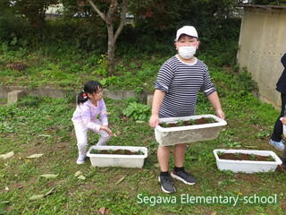 1~4年生には(5年生はお出かけでした)、業間マラソンが終わってから準備したプランターに一気に植栽しました。
