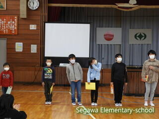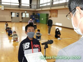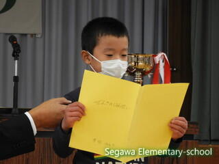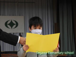 地区理科作品展入選の代表ゆうとさんに、地区書写コンクールは特選の児童に、地区読書感想文コンクールは全員が特選、準特選でしたので全員に賞状を渡しました。