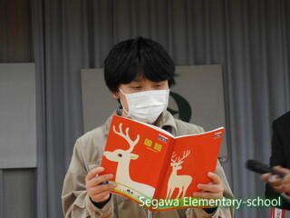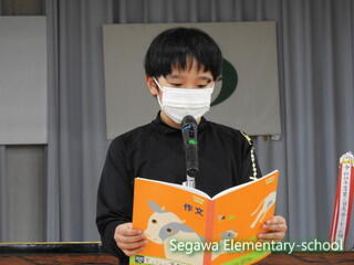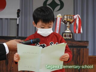 終業式では、各学年代表ががんばったことや最後の半年間にがんばりたいことをみんなの前で発表しました。