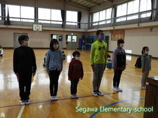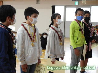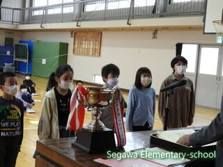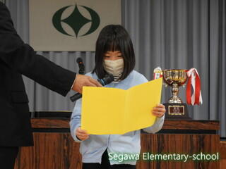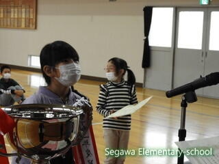 続いて、田村地区小学校陸上競技大会において、優勝した混合リレー、ソフトボール投げを表彰しました。