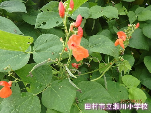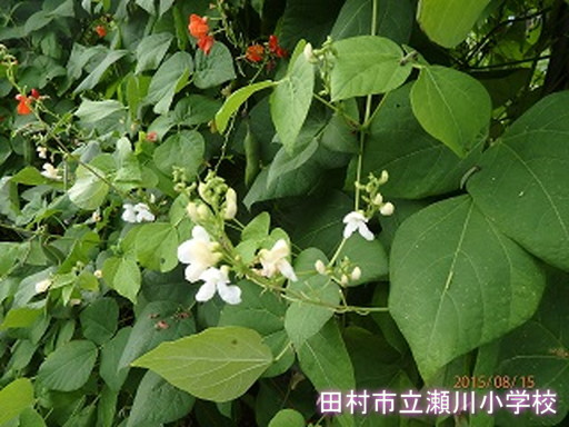 これは、サトイモの葉っぱと花豆(正式には、ベニバナインゲン)です。花豆は、高原の気候に適した作物です。船引町でも栽培しています。花は、赤と白があります。白は、変種で、できる豆も白色です。花をアップで撮影すると・・・・こんな感じです。