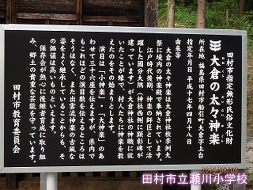 大倉の太々神楽は、平成17年4月18日に「田村市指定無形民俗文化財」に指定されています。以下、田村市教育委員会により掲げられた説明書きより引用します。