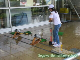 自分たちもやってみます。ペットボトルに水を入れ、ぎゅっと栓をします。ゴム栓についた管から空気を押し込むと・・・