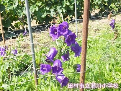 トラックの後を歩いて、畑まで移動します。途中、大きなホタルブクロのきれいな花が咲いていました。