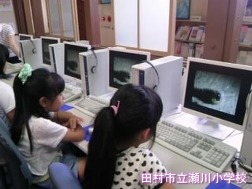 瀬川小学校には、子どもたち用、教師用のパソコンがたくさんあります。教職員には、一人一台のパソコンが割り当てられ、それを使って様々な事務を行っています。子どもたちが使うパソコンは、パソコン室に18台設置されています。全てがインターネットに繋がっていて、調べものをしたり学習したことををプレゼンテーションソフトでまとめたりする事もできます。本校で一番人数の多い6年生でも15人ですので、授業では一人1台以上使用できる環境にあるということになります。この日は、3年生がコンピュータを使って学習していました。どんなふうに使っていたかというと・・・・。理科や社会などでテレビ番組を見たという経験が皆さんあることと思います。先生が授業を行っていて、仮に途中であっても、テレビ番組の時刻に合わせて授業を中断して視聴した覚えがあります。(教員になってからも中断して子どもたちに学習内容に関するテレビ番組を視聴させました。)そういったことに不都合を感じて、録画しておくような事も行いました。しかし、今はそんなことをしなくても大丈夫。授業の進度に合わせて、タイムリーにインターネットでホームページにアクセスすれば番組を視聴できます。この日は、3年生が教師用のパソコンから送られてくるテレビ番組を視聴していました。「百聞は一見にしかず。」 映像は、理解を助ける上で大きな役割を果たしています。授業の進め方、学習のしかたもずいぶん変わって来ました。