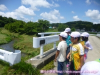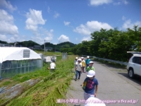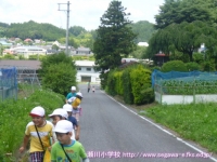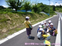 22日に生活科で4回目の町探検に行ってきました。今回は新舘から長外路を通って,石沢地区の入り口に出て,移川沿いを通って学校に戻ってくるコースでした。途中どこかの建物に寄るのではなく,とにかく歩くコースです。みんな水分の準備ばっちりで出発しました。 はじめにクラスメートのHさんの家の前を通りました。ちょうど妹さんが窓から顔を出して,行ってきますのあいさつをしました。するとHさんのお母様が出ていらして,「ちょうどあったので。」とすてきな赤い大粒のさくらんぼをおやつに持たせてくださいました。(途中,休憩したときにみんなでいただきました。とてもおいしかったです。)そこからは「たくさんの人にあいさつをしよう」というめあてだったのですがあまり人には会えず,笹の葉や木いちごの実,赤い実,桑の木の実を眺めながらとにかく歩きました。上級生(4年生)のHさんの家の前を通ったときに,「何年生だい?」とHさんのおばあちゃんに声を掛けてもらい,「2年生です。町探検に来ました。」と答えたところ,「今,いいもの持ってくるから。」と,全員にアイスクリームをいただきました。みんな歩くのに疲れていたところで,心から「いただきます!」をしてのどを潤しました。また,近所のお母さんも出てきてくださって声を掛けていただきました。うれしかったです。地域の方とのたくさんの触れ合いをすることができ,心温まる,運動になった探検でした。次回はまた計画を立ててから出発したいと思います。