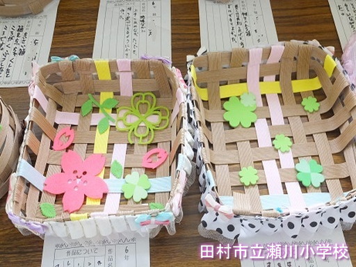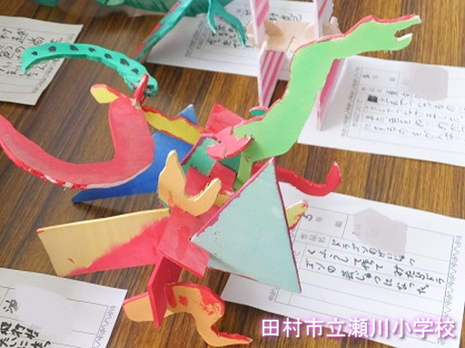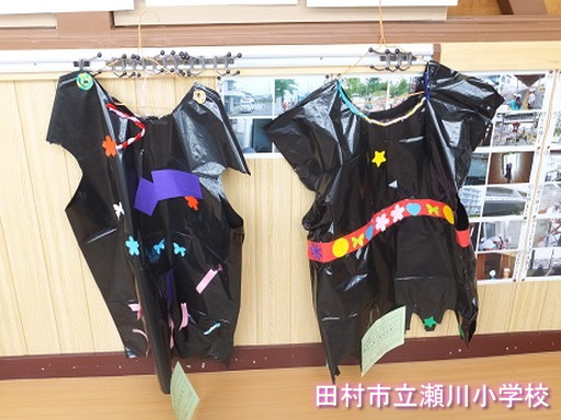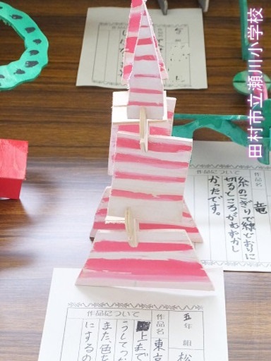 校舎内を歩いていると、たくさんの子どもたちの芸術作品に出会います。布に絵の具で模様を描いたもの、ビニールや色紙を使って作った洋服、テープを編んで作った入れ物、板を糸鋸で切って組み合わせて作成したオブジェなど・・・作品のいくつかを紹介します。